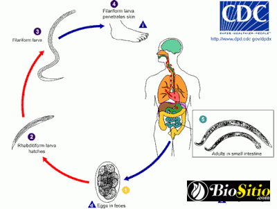 Las larvas rhabditiformes pasan por dos etapas de desarrollo más antes de convertirse en larvas filariformes, que son las formas infectantes para el huésped humano. Estas larvas filariformes pueden reinfectar al mismo huésped o infectar a otros huéspedes.